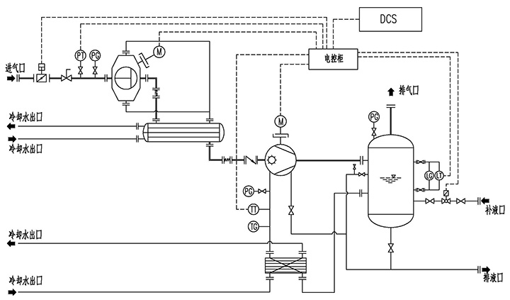 具體的思路為,不改變原裝置中的水環(huán)式抽真空系統(tǒng)的設備及功能,在抽真空主管道上并接一套羅茨水環(huán)高效真空機組。在機組啟動建立真空期間,首先由原裝置水環(huán)式抽真空系統(tǒng)進行快速預抽,以達到啟動真空,在正常運行保持真空階段,使用羅茨水環(huán)高效真空機組進行維持真空。