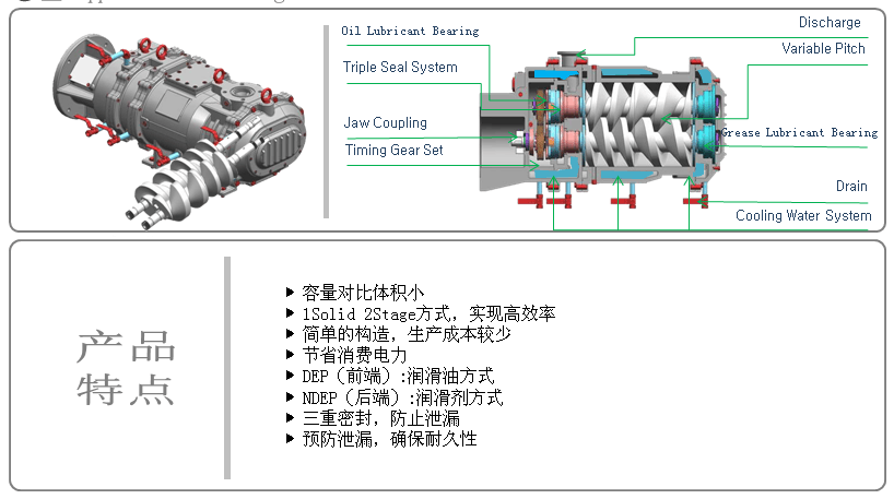 l  泵體內(nèi)僅兩個(gè)螺桿轉(zhuǎn)子運(yùn)轉(zhuǎn),螺桿之間及螺桿與泵體之間無(wú)接觸