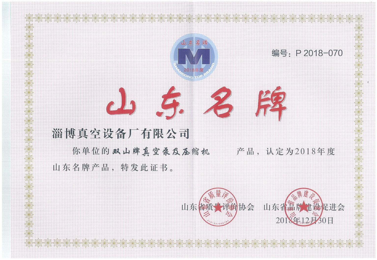 公司生產(chǎn)的“雙山”牌真空泵被山東省質(zhì)量評價協(xié)會和山東省品牌建設促進會認定為山東名牌