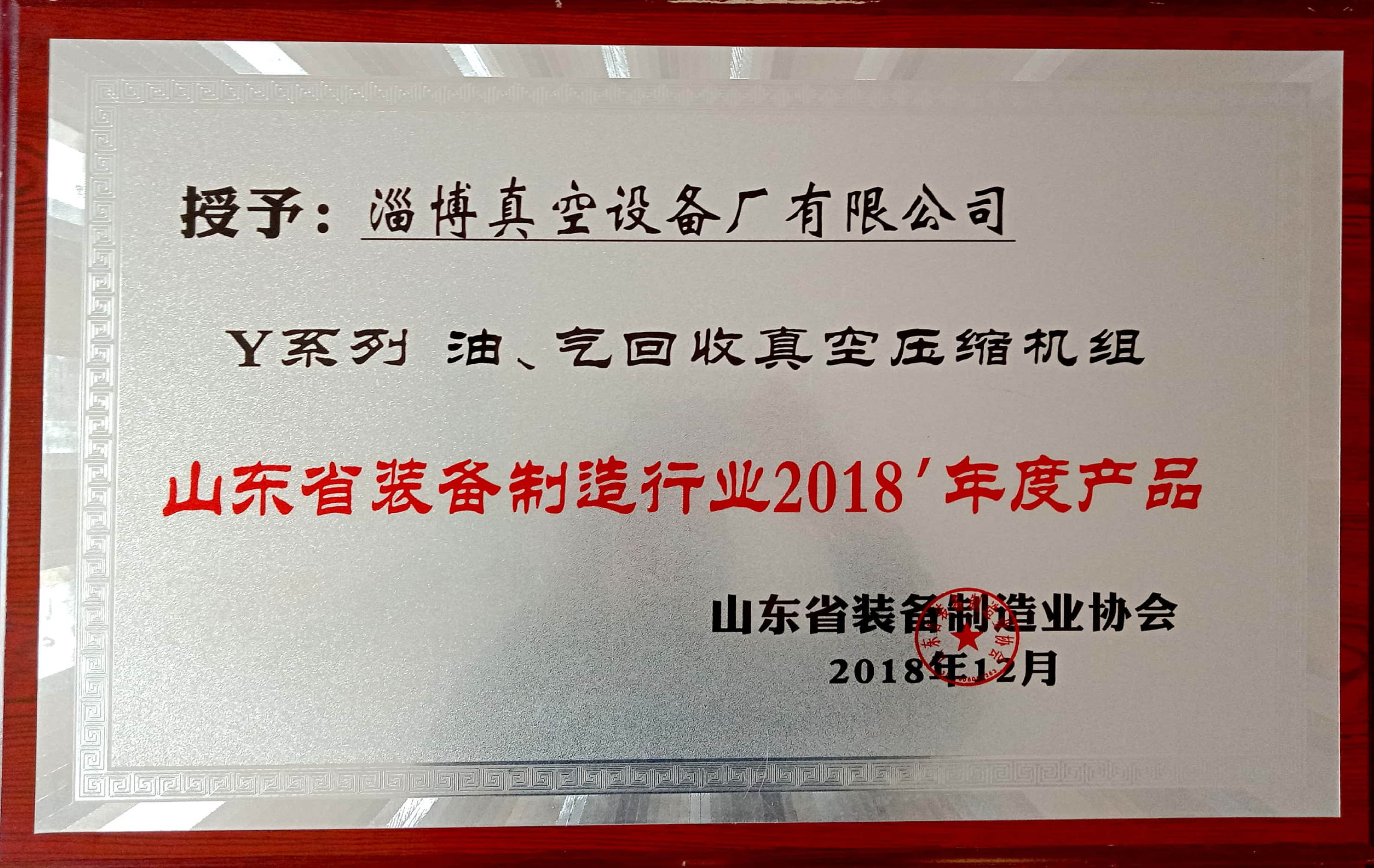 淄博真空設備廠有限公司被授予“山東省裝備制造行業(yè)優(yōu)秀企業(yè)”、“優(yōu)秀會員企業(yè)”,公司董事長黃毅同志被授予“山東省裝備制造業(yè)優(yōu)秀企業(yè)家”; 公司產(chǎn)品Y系列油、氣回收真空壓縮機組獲2018山東省裝備制造行業(yè)年度產(chǎn)品。
