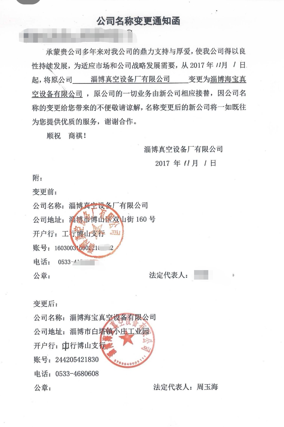 淄博海寶真空設備有限公司未經(jīng)我公司授權,私自出具變更函,給客戶和我公司帶來了巨大影響,該變更函純屬海寶真空私自偽造,提醒廣大用戶接收到類似變更函,一定要先與我公司核實,避免造成重大損失。
